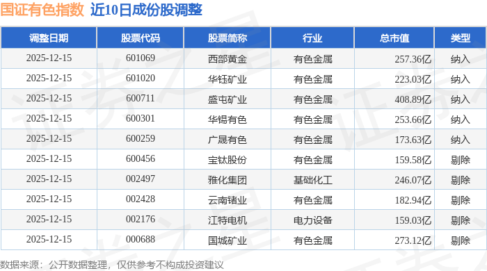 近10日内国证有色(399395)指数成份股做了调整,新纳入了5只股票,剔除了5只股票。