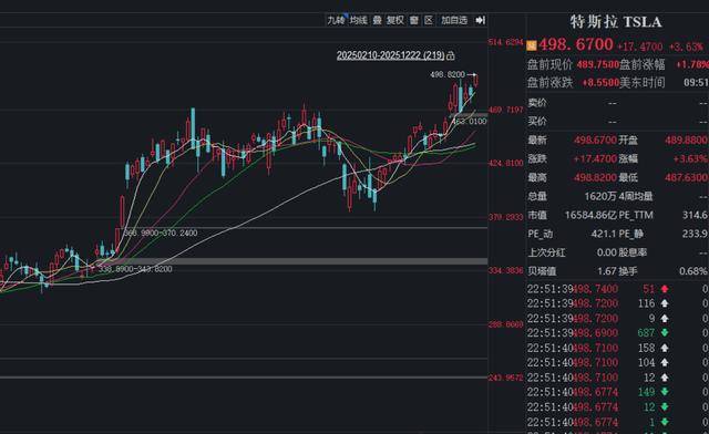 12月22日,特斯拉(TSLA.US)盘中拉升,股价创历史新高,一度逼近500美元关口。据同花顺数据,特斯拉盘中创498.83美元,市值一度超16580亿美元。