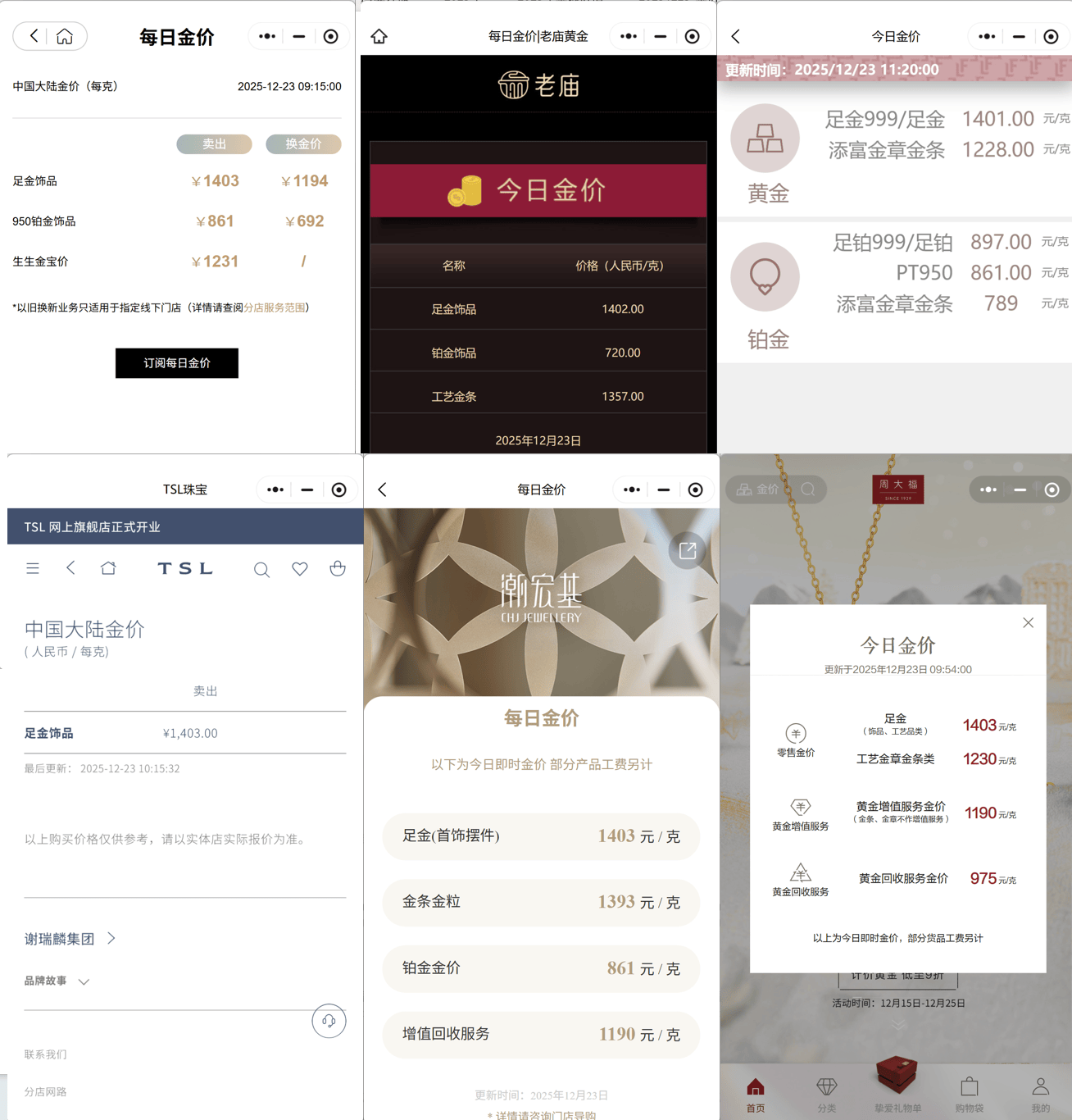 具体而言,当日,周大福足金(饰品、工艺品类)、谢瑞麟足金饰品、潮宏基足金(首饰摆件)、周生生足金饰品境内价格为1403元/克,老庙黄金上海区域足金饰品价格为1402元/克,六福珠宝足金999/足金境内价格为1401元/克。