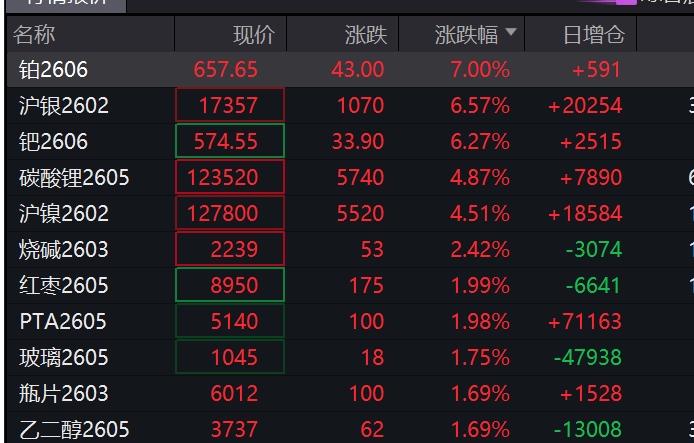 而这轮波澜壮阔的涨势正迅速传导至全球市场。国内商品期货市场开盘后,铂期货主力合约触及涨停,沪银、钯金期货涨幅均超过6%。