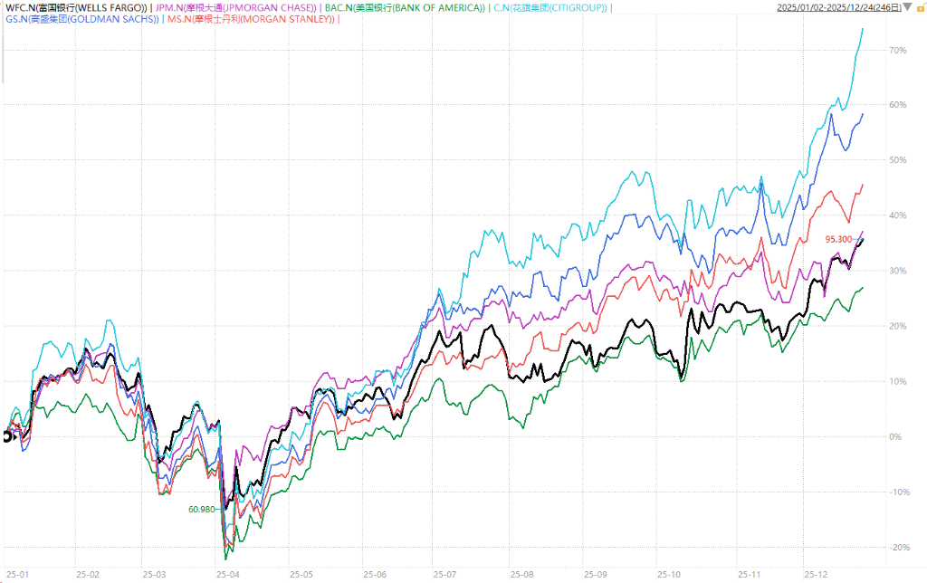 花旗集团成为2025年六大美国银行中表现最佳的股票,股价上涨约70%。