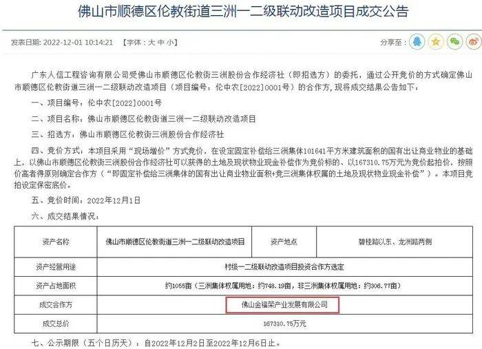 2022年6月,房地产行业深度调整之际,黄仕坤实控的佛山金福荣产业发展有限公司竞得广东佛山顺德伦教三洲村的356.6亩旧改地块,计划投资60亿元建设黄金珠宝创新生态城。但一直到今年年底,该项目仍主要停留在拆迁阶段,建设进度明显滞后,巨量资金长期沉淀,几乎无法形成回流。