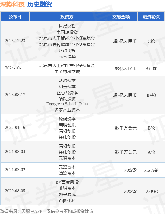 证券之星消息,根据天眼查APP于12月23日公布的信息整理,北京深势科技有限公司C轮融资,融资额超8亿人民币,参与投资的机构包括达晨财智,京国瑞投资,北京市人工智能产业投资基金,北京市医药健康产业投资基金,联想创投,元禾璞华。