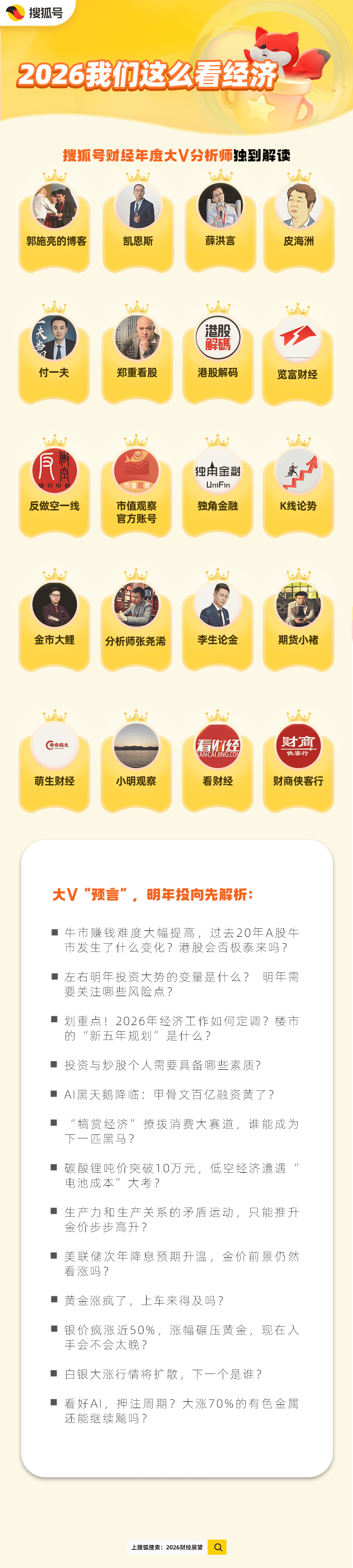 【2026我们这么看经济】第二谈聚焦方向,看看搜狐号财经大V分析师@郭施亮的博客、@凯恩斯、@薛洪言、@皮海洲、@付一夫、@郑重看股、@港股解码、@览富财经、@反做空一线、@市值观察官方、@独角金融、@K线论势、@金市大鲤、@分析师张尧浠、@李生论金、@期货小褚、@萌生财经、@小明观察、@看财经、@财商侠客行的专业视角。