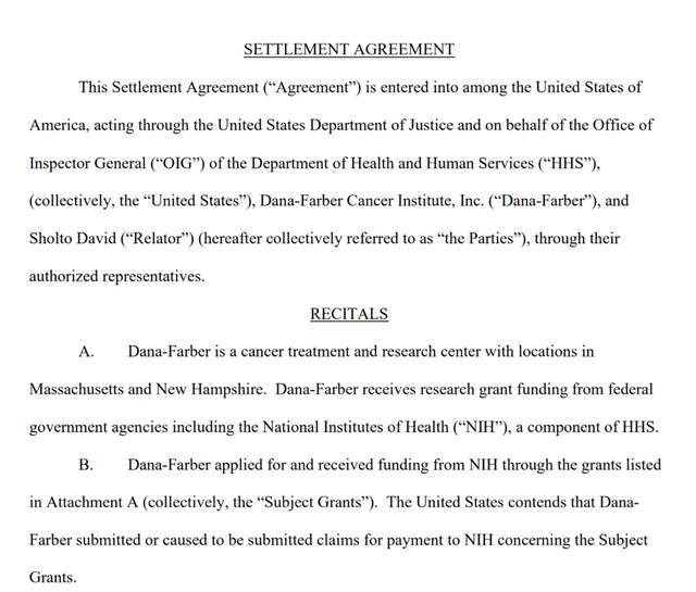 2025年12月16日,美国司法部宣布,哈佛大学附属的著名癌症研究中心——丹娜-法伯癌症研究所(Dana-Farber Cancer Institute)同意支付1500万美元来和解一桩根据《虚假申报法》(False Claims Act)提起的诉讼。该中心承认在向国国立卫生研究院(NIH)申请研究资助时使用了多份被篡改和重复的图片和数据,除了退还部分研究经费,还支付了850万美元的罚款给NIH,而举报人、学术侦探肖尔托·戴维(Sholto David)将获得263万美元。