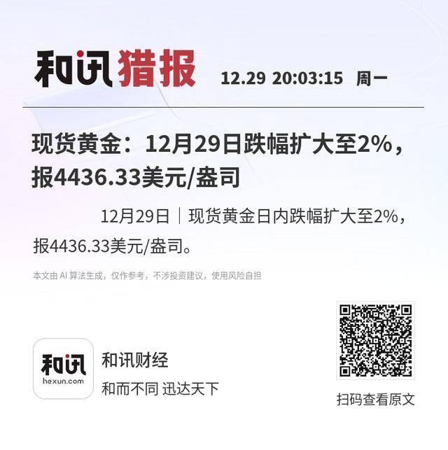 12月29日|现货黄金日内跌幅扩大至2%,报4436.33美元/盎司。