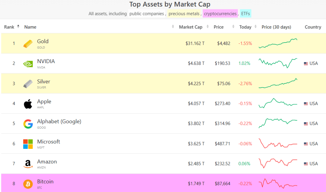 12月29日,根据市值数据平台CompaniesMarketCap的数据,白银市值已超越苹果,晋升为全球第三大资产。