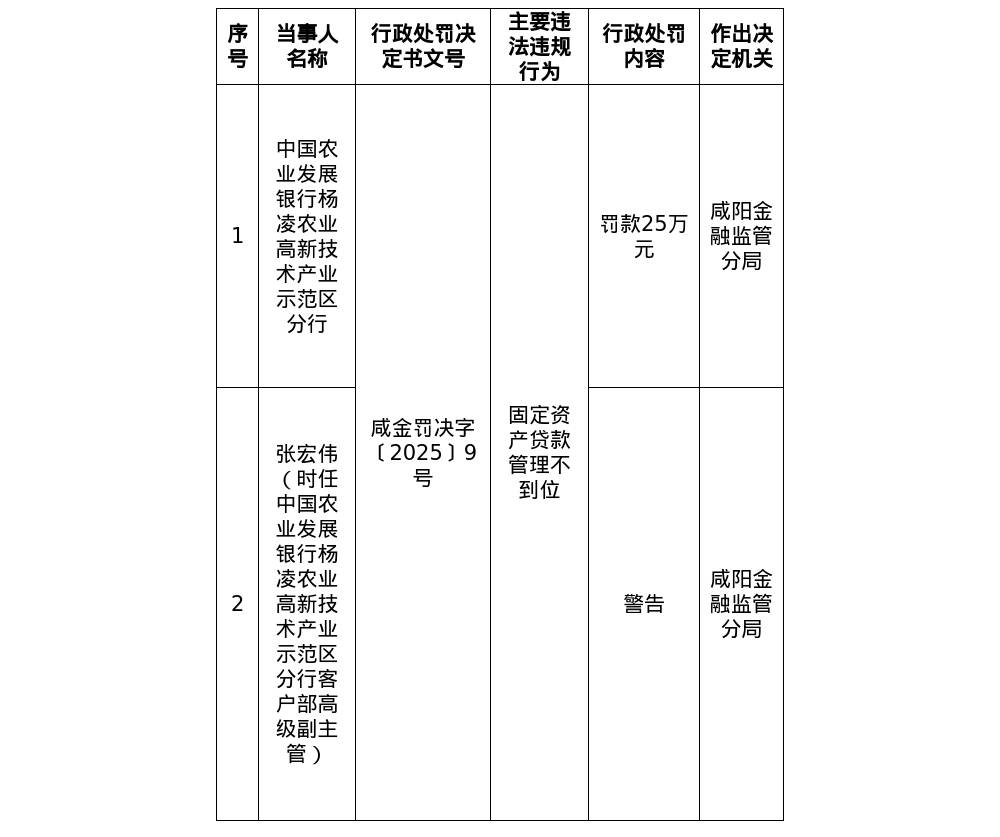 针对这一行为,国家金融监督管理总局咸阳监管分局对其罚款25万元;对时任中国农业发展银行杨凌农业高新技术产业示范区分行客户部高级副主管张宏伟给予警告处分。