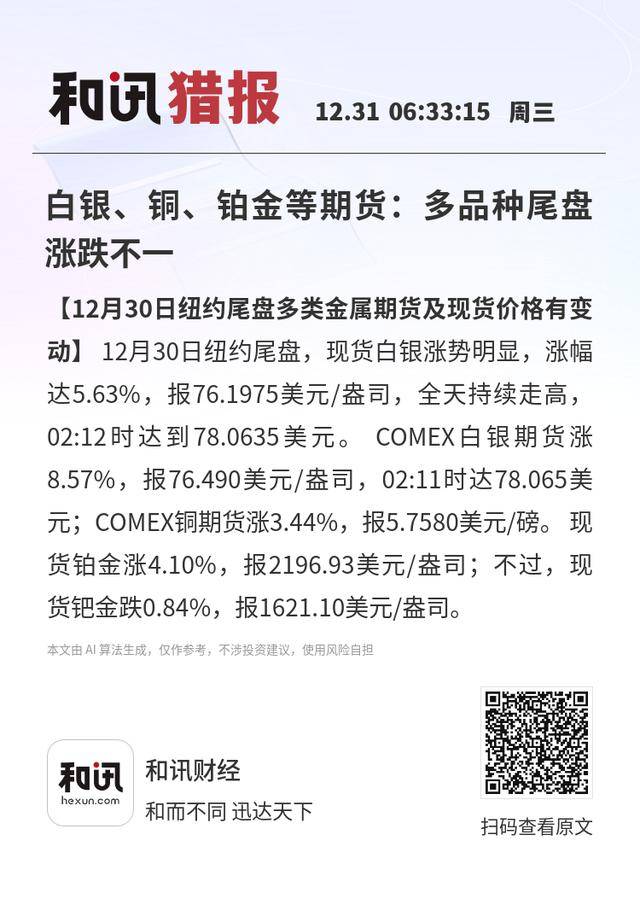 【12月30日纽约尾盘多类金属期货及现货价格有变动】12月30日纽约尾盘,现货白银涨势明显,涨幅达5.63%,报76.1975美元/盎司,全天持续走高,02:12时达到78.0635美元。COMEX白银期货涨8.57%,报76.490美元/盎司,02:11时达78.065美元;COMEX铜期货涨3.44%,报5.7580美元/磅。现货铂金涨4.10%,报2196.93美元/盎司;不过,现货钯金跌0.84%,报1621.10美元/盎司。