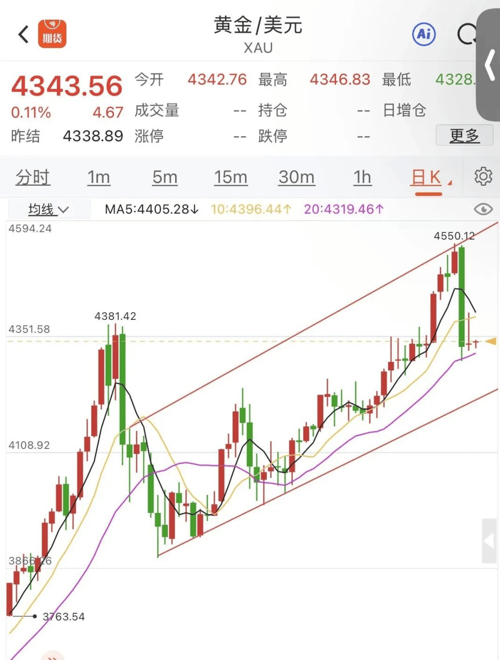 今天无论如何冲高,都不能再破昨天高点,不能站上4400大关,否则多头又要慢爬重启了!下方4300大关一旦击穿,行情继续考验多头生命线3886以来的上涨趋势支撑!因此,马上阳历年,稳健起见观望,节后再战!杠杆产品,激进则冲高以阻力区域为压制分别参与空头,关注4300大关破位情况,下破前可继续短多,严格止损!积存金等非杠杆产品,耐心等待,破4300有更好的位置,不破等,也不差这几天;这种产品,短线没必要折腾!实物,持有就行!