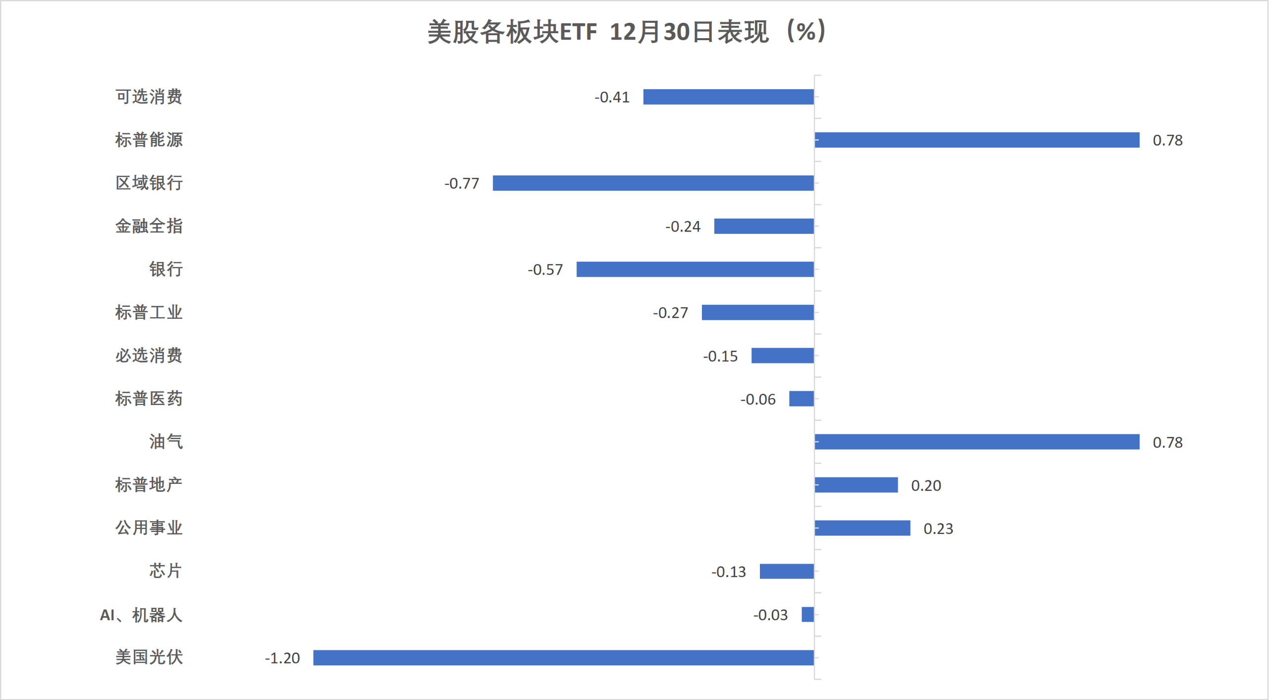 周二美股三大股指三连跌。生物科技ETF收跌将近1.1%,领跌美股行业ETF,能源ETF涨约0.8%。Meta涨1.10%。