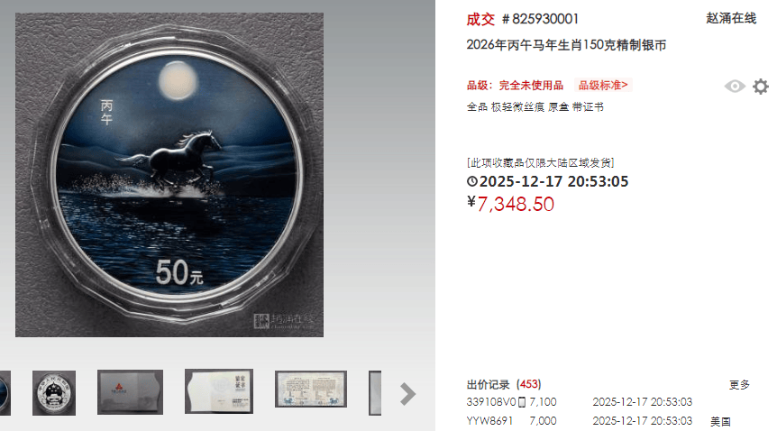 最近钱币收藏圈里,一个成交引发了不小的关注:一枚2026年丙午马年150克彩色精制银币,在激烈竞逐后以7348.50元的价格落槌。这个价格,对于一枚新近发行的生肖银币而言,无疑是一个令人瞩目的市场信号。