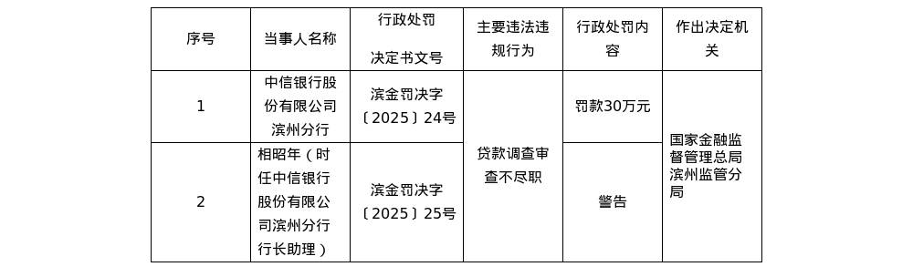 针对这一行为,国家金融监督管理总局滨州监管分局对其处以30万元罚款;对中信银行股份有限公司滨州分行行长助理相昭年警告。