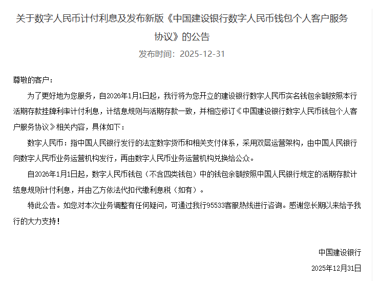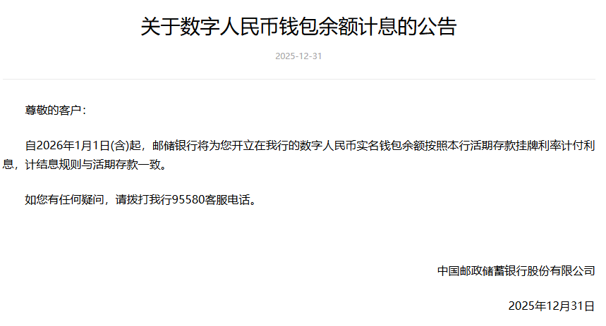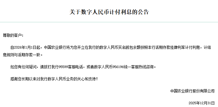 【大河财立方消息】12月31日,工商银行、农业银行、邮储银行、交通银行、建设银行分别发布公告称,自2026年1月1日起,为数字人民币实名钱包余额按照活期存款挂牌利率计付利息,计结息规则与活期存款一致。