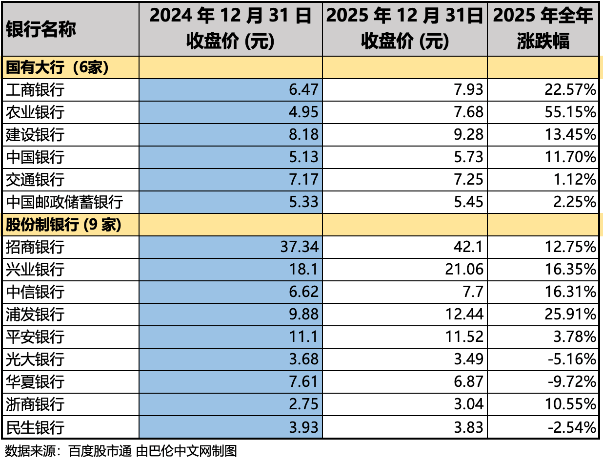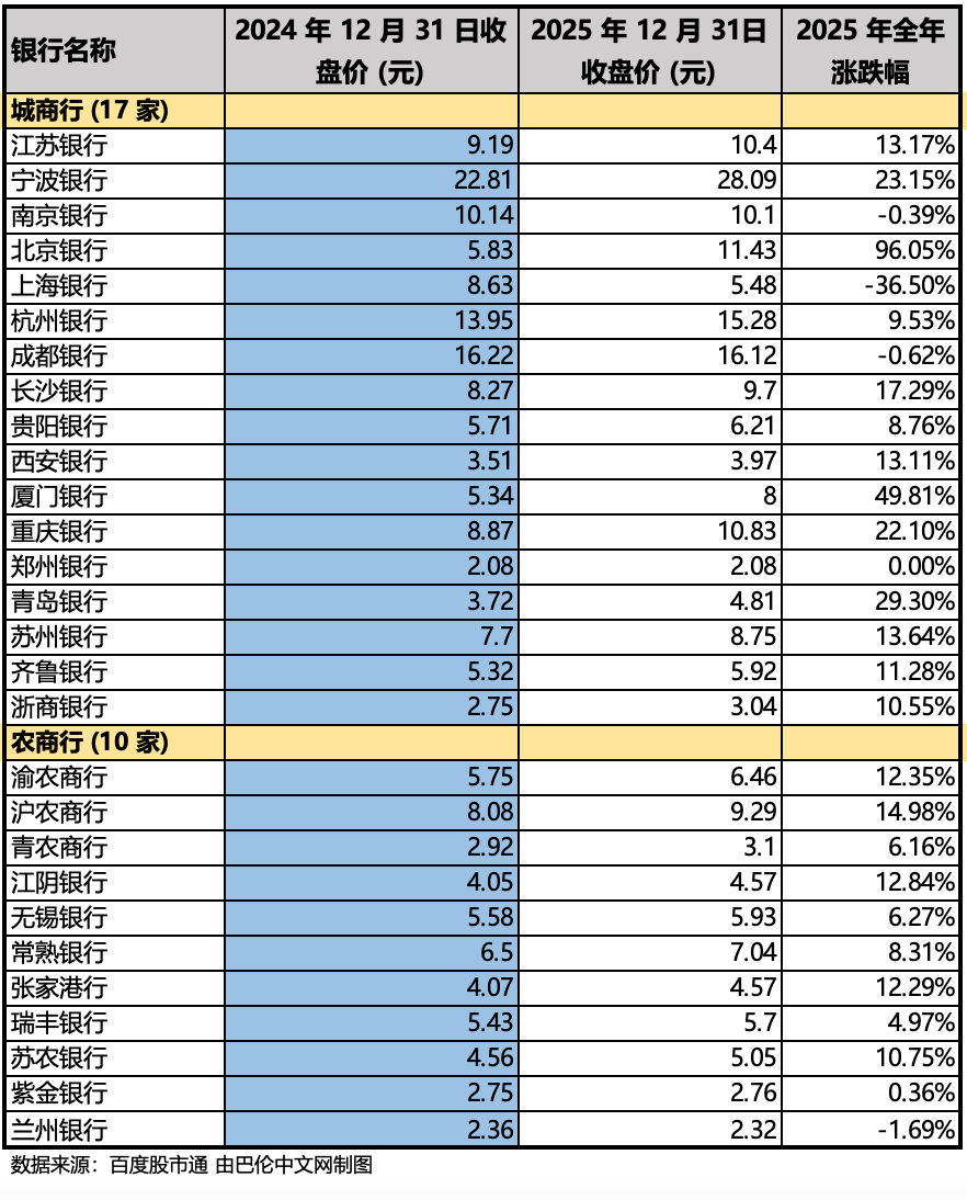 2025年A股银行板块在复杂的宏观经济环境与政策调控中,走出了鲜明的结构性行情。全年申万银行指数上涨16.2%,在31个申万一级行业中位居中游,虽不及新能源、人工智能等成长板块的爆发力,但显著跑赢地产、建筑等强周期板块。从细分领域看,国有大行凭借高股息与政策红利成为绝对领跑者,区域中小银行呈现“头部狂欢、尾部平淡”的分化格局,而部分股份制银行则因资产质量压力与转型滞后陷入增长困境。