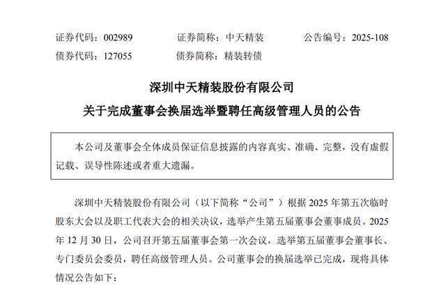 乐居财经 李兰12月31日,中天精装(002989.SZ)发布公告,公司已完成第五届董事会的换届选举及高级管理人员的聘任工作。