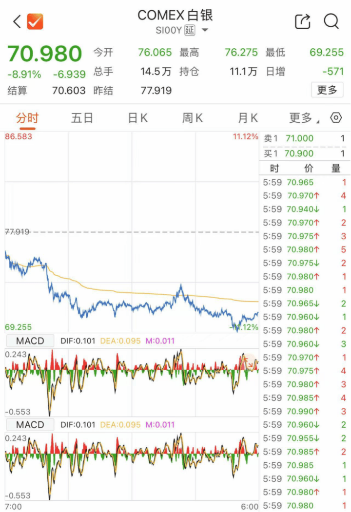 隔夜,黄金、白银价格又一次跳水。纽约期金跌超1%,伦敦现货白银盘中跌超8%,从最高76美元/盎司左右一路跌至70美元/盎司附近。COMEX白银期价大跌近9%,最低价格一度跌破70美元/盎司关口。