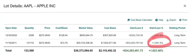 段永平称,“这是我管的一个账号上的苹果(股票),这么多年几乎没怎么动过。”图片显示,该账号分别于2011年11月和2022年12月买入苹果股票,第一次购入13.1万股,平均价13.75美元/股;第二次购入2388股,平均价128.94美元/股。两次投资分别为段永平带来3392万美元、34.27万美元的收益,收益率高达1881.8%、111.3%。