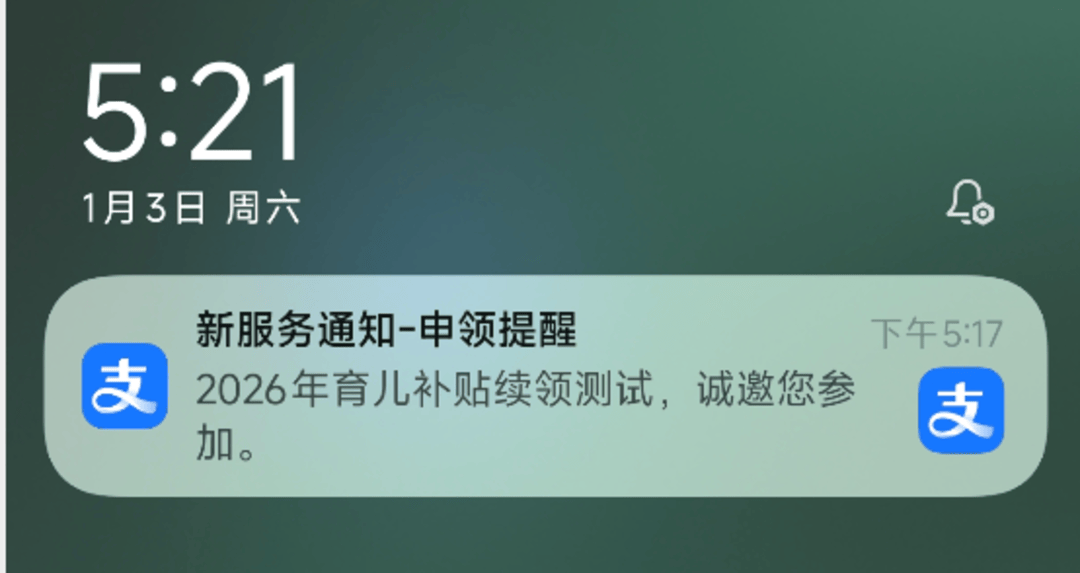 1月4日,2026年育儿补贴系统正在进行续领测试,已有人收到支付宝邀约并完成申领。