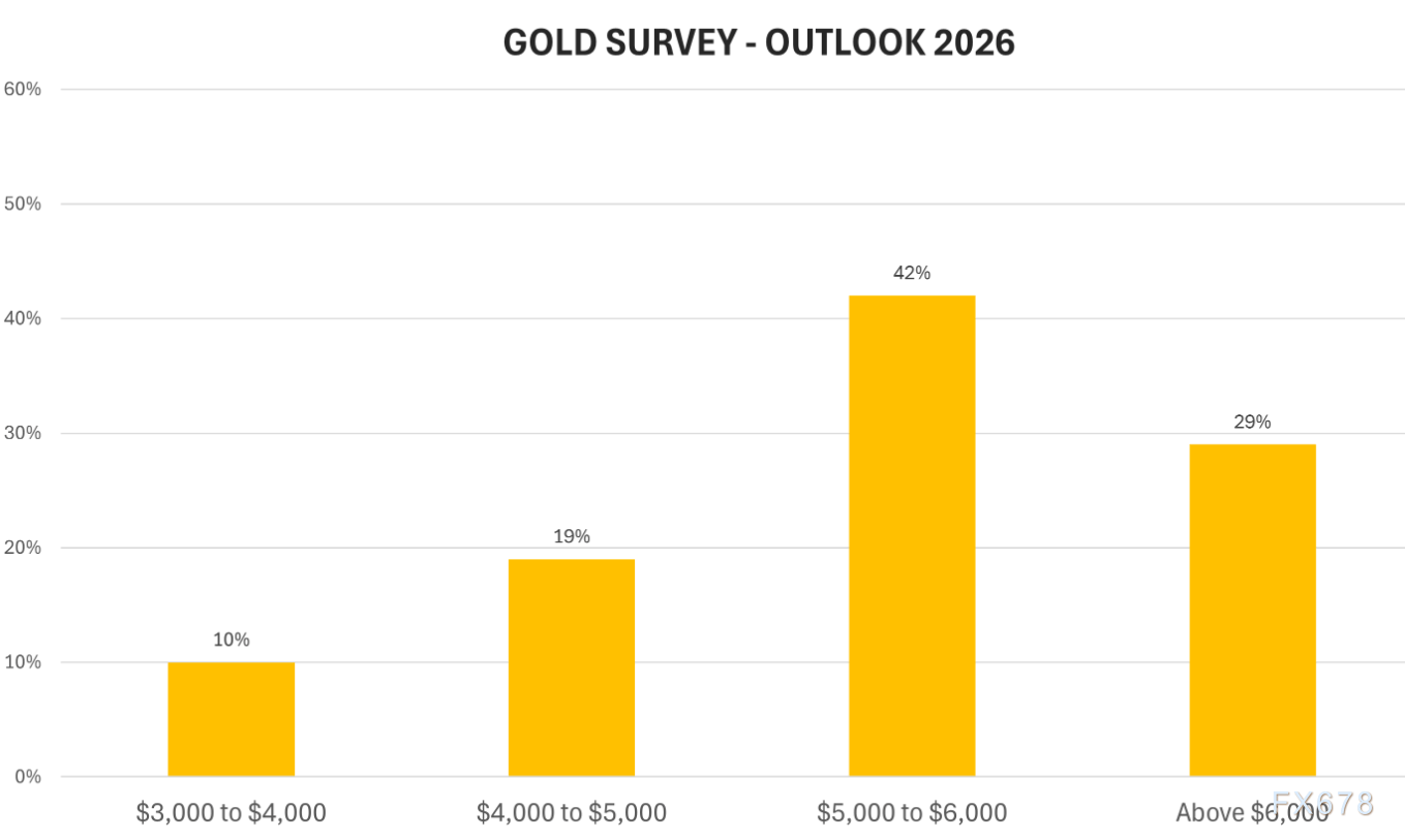 抛开短期波动,从更长周期视角审视,黄金市场洋溢着乐观情绪。回顾2025年,金价实现了约65%的惊人涨幅,表现远超多数和资产类别。进入2026年,这种看涨预期有增无减。Kitco新闻的年度调查揭示了市场的狂热信心:在参与调查的零售投资者中,高达42%的人预测金价将在2026年升至5000至6000美元之间;更有29%的投资者看高至6000美元以上。相比之下,认为金价会跌回4000美元以下的仅占十分之一。这种来自“民间”的强烈看多情绪,是市场情绪的重要风向标。