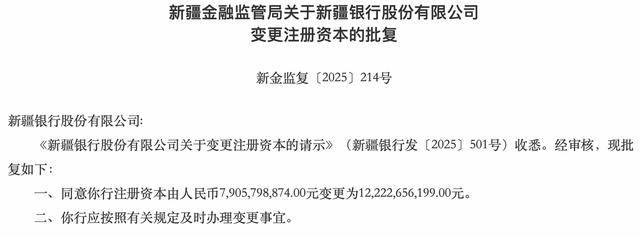 1月4日,新疆金融监管发布的行政许可信息显示,同意新疆银行股份有限公司注册资本由79.06亿元变更122.23亿元。