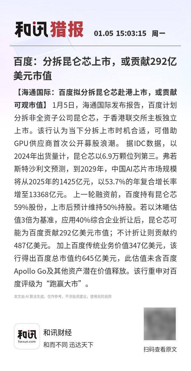 【海通国际:百度拟分拆昆仑芯赴港上市,或贡献可观市值】1月5日,海通国际发布报告,百度计划分拆非全资子公司昆仑芯,于香港联交所主板独立上市。该行认为当下分拆上市时机合适,可借助GPU供应商首次公开募股浪潮。 据IDC数据,以2024年出货量计,昆仑芯以6.9万颗位列第三。弗若斯特沙利文预测,到2029年,中国AI芯片市场规模将从2025年的1425亿元,以53.7%的年复合增长率增至13368亿元。 上一轮融资前,百度持有昆仑芯59%股份,上市后预计维持50%持股。若以沐曦估值3倍为基准,应用40%综合企业折让后,昆仑芯可能为百度贡献292亿美元市值;不计折让则贡献约487亿美元。 加上百度传统业务价值347亿美元,该行得出百度总市值约645亿美元,此估值未含百度Apollo Go及其他资产潜在价值释放。该行重申对百度评级为“跑赢大市”。
