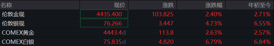 1月5日,亚市时段,现货黄金(伦敦金现)震荡上涨,飙升至每盎司4400美元上方。截至发稿,现货黄金价格报4435.4美元/盎司,涨2.4%;COMEX黄金期货价格报4443.4美元/盎司,日内涨2.63%。伦敦银现报76.266美元/盎司,日内涨4.73%;COMEX白银报75.835美元/盎司,日内涨6.79%。