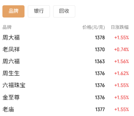 国内金饰价格同样回升,周大福金饰报1378元/克,周生生金饰报1376元/克,老庙黄金金饰报1377元/克,老凤祥金饰报1370元/克,普遍较昨日上涨超20元。