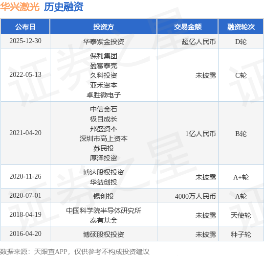 证券之星消息,根据天眼查APP于12月30日公布的信息整理,江苏华兴激光科技有限公司D轮融资,融资额超亿人民币,参与投资的机构包括华泰紫金投资。