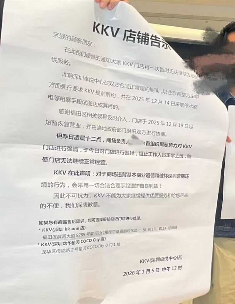 2025年12月14日,KKV深圳卓悦中心店贴出闭店公告称,深圳卓悦中心于疫情招商困难之际邀请KKV入驻,但近期采取停水断电等粗暴手段强制该店提前解约,该店控诉卓悦中心“违背基本商业道德”“破坏营商环境”。