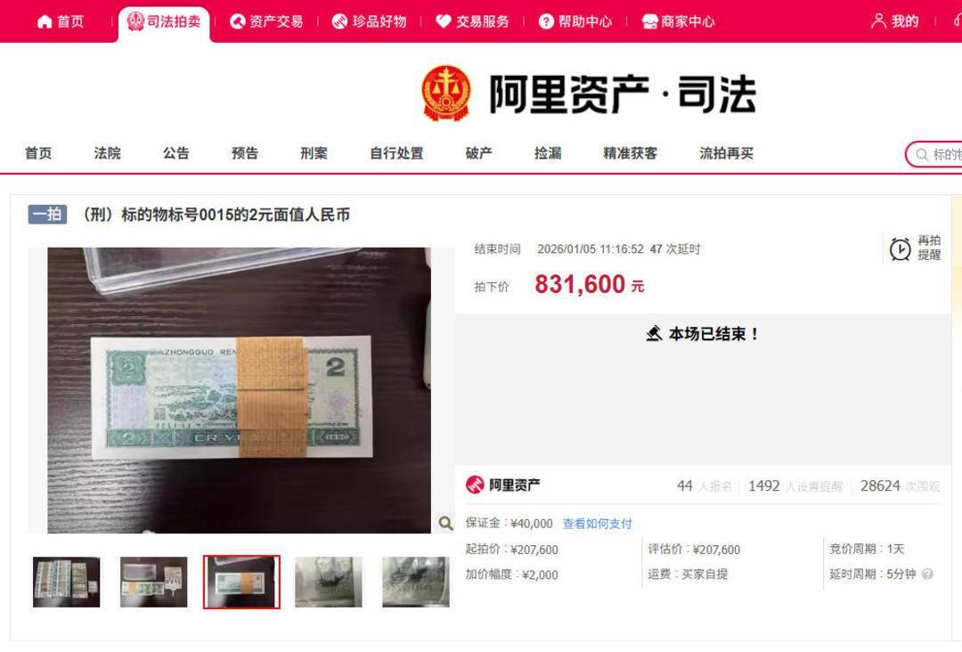 55捆共计10500张第四套2元面值人民币被浙江省永嘉县人民法院在阿里资产平台公开拍卖,经过激烈竞价,1月5日以约为起拍价四倍的金额即83.16万元成交。此次拍卖为何会呈现出如此高的热度?有收藏界人士分析,被拍卖的2元纸币均已“绝版”,特别是其中包含三捆俗称为“绿幽灵”的稀有版本是主要原因,这也导致拍卖取得了较高的成交溢价。