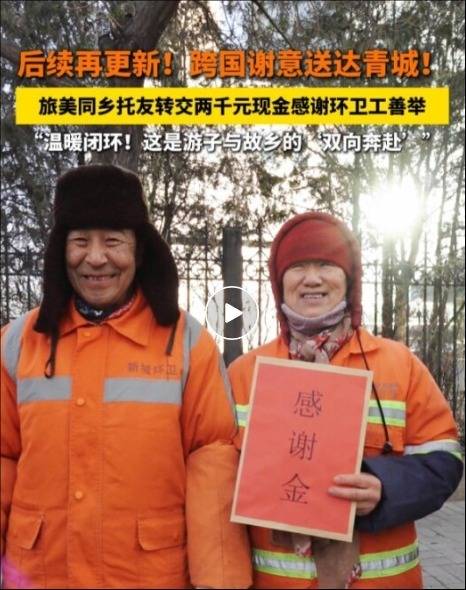 冬日青城,阳光和煦。一份源自上万公里外的真挚谢意,历经辗转,今日终于抵达了它想要温暖的人手中。1月6日,田女士、鄂女士受旅美同乡安女士的郑重委托,专程来到环卫工人刘玉根、张改桃夫妇的工作区域,将饱含感激之情的2000元现金,亲手交到了夫妇二人手中。这一刻,一个关于善意与感恩的温暖故事,画上了又一个动人的注脚。