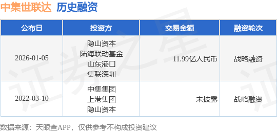 证券之星消息,根据天眼查APP于1月5日公布的信息整理,中集世联达物流科技(集团)股份有限公司战略融资,融资额11.99亿人民币,参与投资的机构包括隐山资本,陆海联动基金,山东港口,集联深圳。