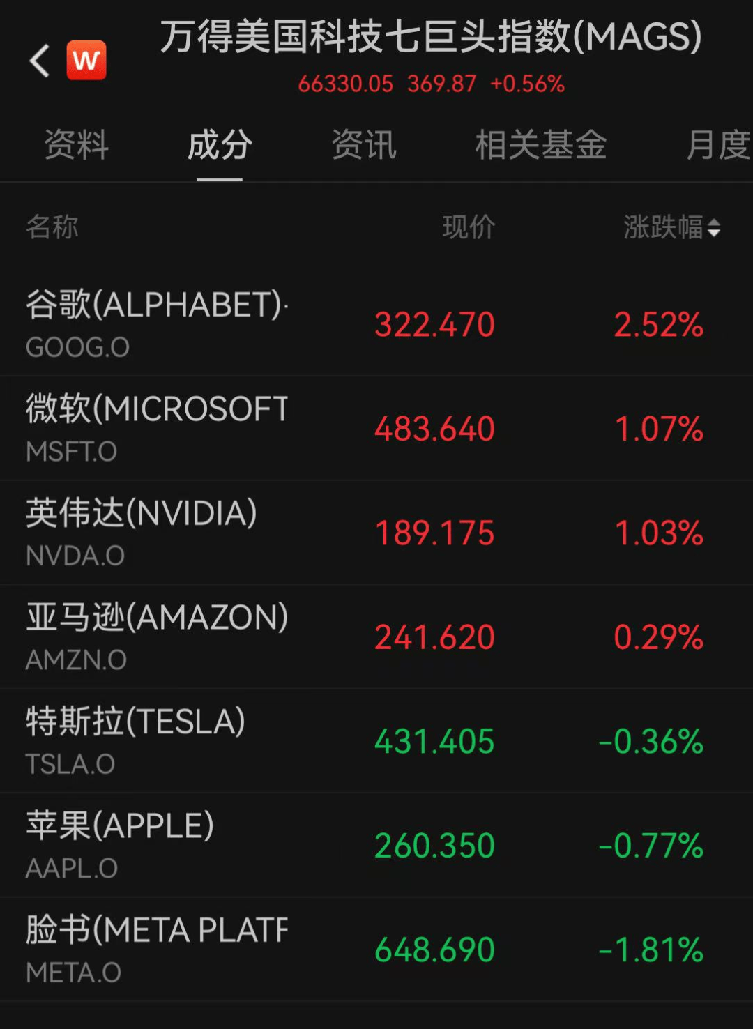 大型科技股涨跌不一,万得美国科技七巨头指数上涨0.56%。谷歌母公司Alphabet-C上涨2.52%,微软上涨1.07%,英伟达上涨1.03%,亚马逊上涨0.29%,特斯拉下跌0.36%,苹果下跌0.77%,META下跌1.81%。谷歌-C总市值为38945亿美元,苹果总市值为38470亿美元,谷歌-C总市值超过苹果。