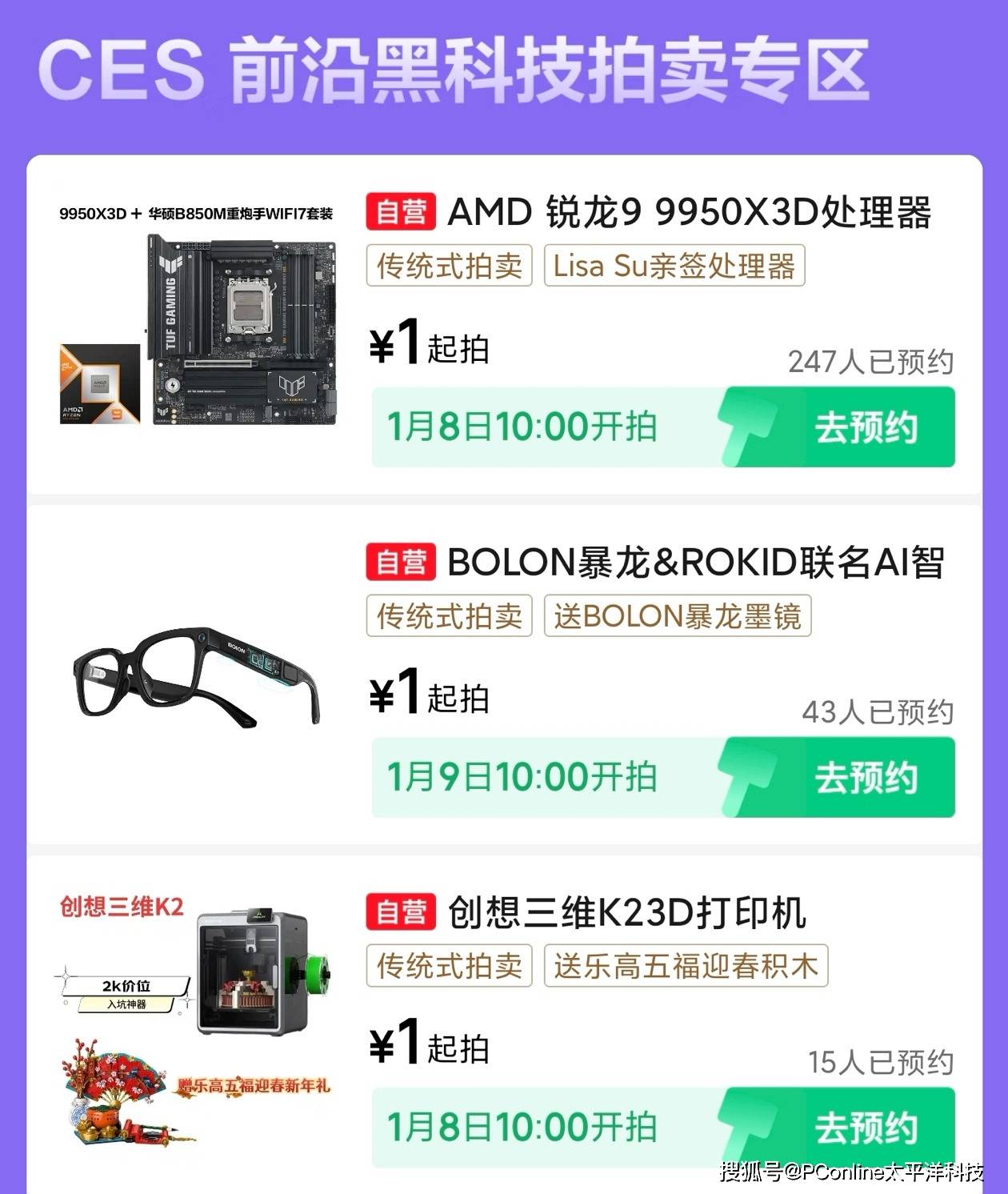 针对多款最具代表性的展会新品,京东还推出了“CES全球新品1元起拍”活动,涵盖智能眼镜、3D打印设备及处理器等多个品类,均可在京东拍卖1元起拍。创想三维K2 3D打印机搭配稀缺款乐高、AMD锐龙9 9950X3D处理器(LISA SU签名款)、暴龙与Rokid联名款AI智能眼镜等稀缺尖货均将于1月8日10点起陆续开拍。