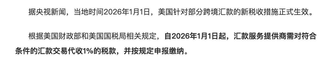 导语: 任何一项政策,其深层影响往往在于中长期。2026年1月1日正式生效的美国跨境汇款新税政策,不仅是一个税务变动,更是跨境汇款行业进入“全透明、全数字化”时代的信号。