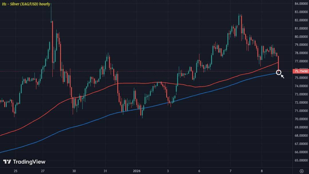 白银同样出现类似情况:今日迄今跌幅接近3%,价格被拉回至200小时均线(蓝线)附近,当前该均线位于75.59美元。若能守住这一位置,买方仍能保留一定的短线控制力;但若跌破,则短线偏向也将转向更偏空。