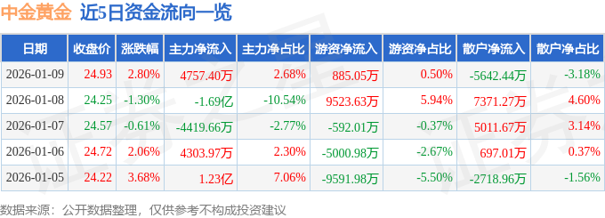 证券之星消息,截至2026年1月9日收盘,中金黄金(600489)报收于24.93元,上涨2.8%,换手率1.47%,成交量71.49万手,成交额17.75亿元。