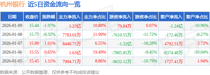 证券之星消息,截至2026年1月9日收盘,杭州银行(600926)报收于15.44元,下跌1.97%,换手率1.01%,成交量73.37万手,成交额11.3亿元。