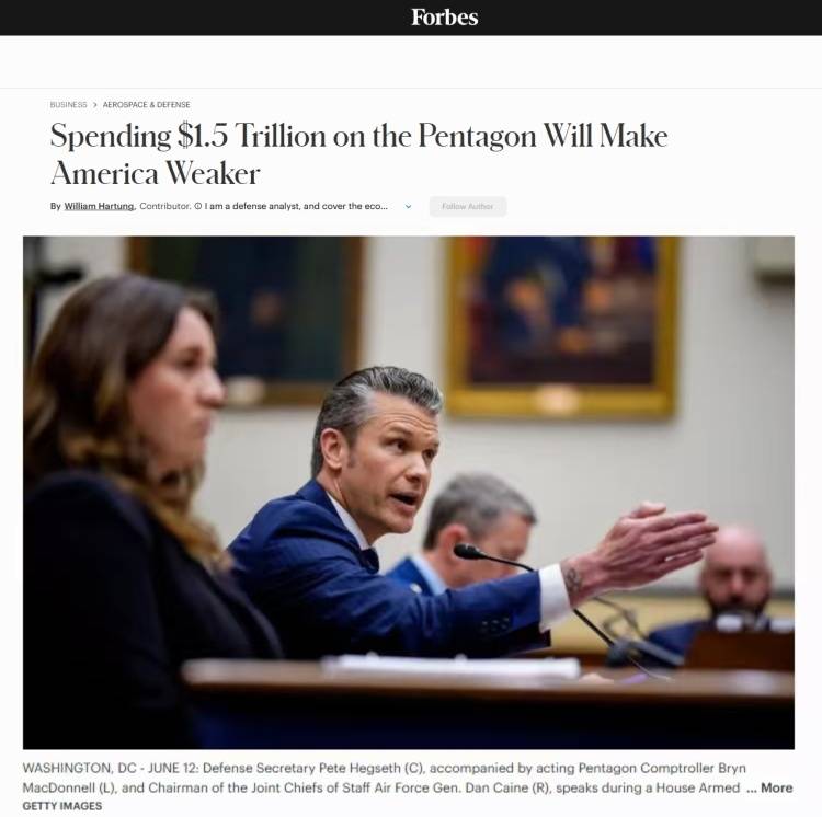 文章最后说,五角大楼需要的不是增加开支,而是强化支出管理。更重要的是,需要制定新战略,不应再追求具备随时在全球任何角落发动战争的能力。国会不应为五角大楼巨额预算增长提案欢呼,而应认真质询新增军费究竟能为美国及其盟友的安全带来何种实质成效。