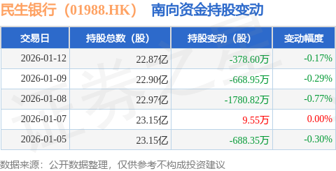 证券之星消息,1月12日南向资金减持378.6万股民生银行(01988.HK)。近5个交易日中,获南向资金减持的有4天,累计净减持3507.17万股。近20个交易日中,获南向资金减持的有14天,累计净减持7864.43万股。截至目前,南向资金持有民生银行(01988.HK)22.87亿股,占公司已发行普通股的27.47%。