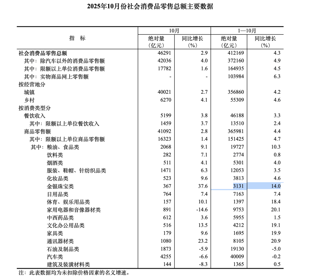 国家统计局数据显示,2025年1-10月限额以上金银珠宝零售总额达3131亿元、同比增长14.0%。