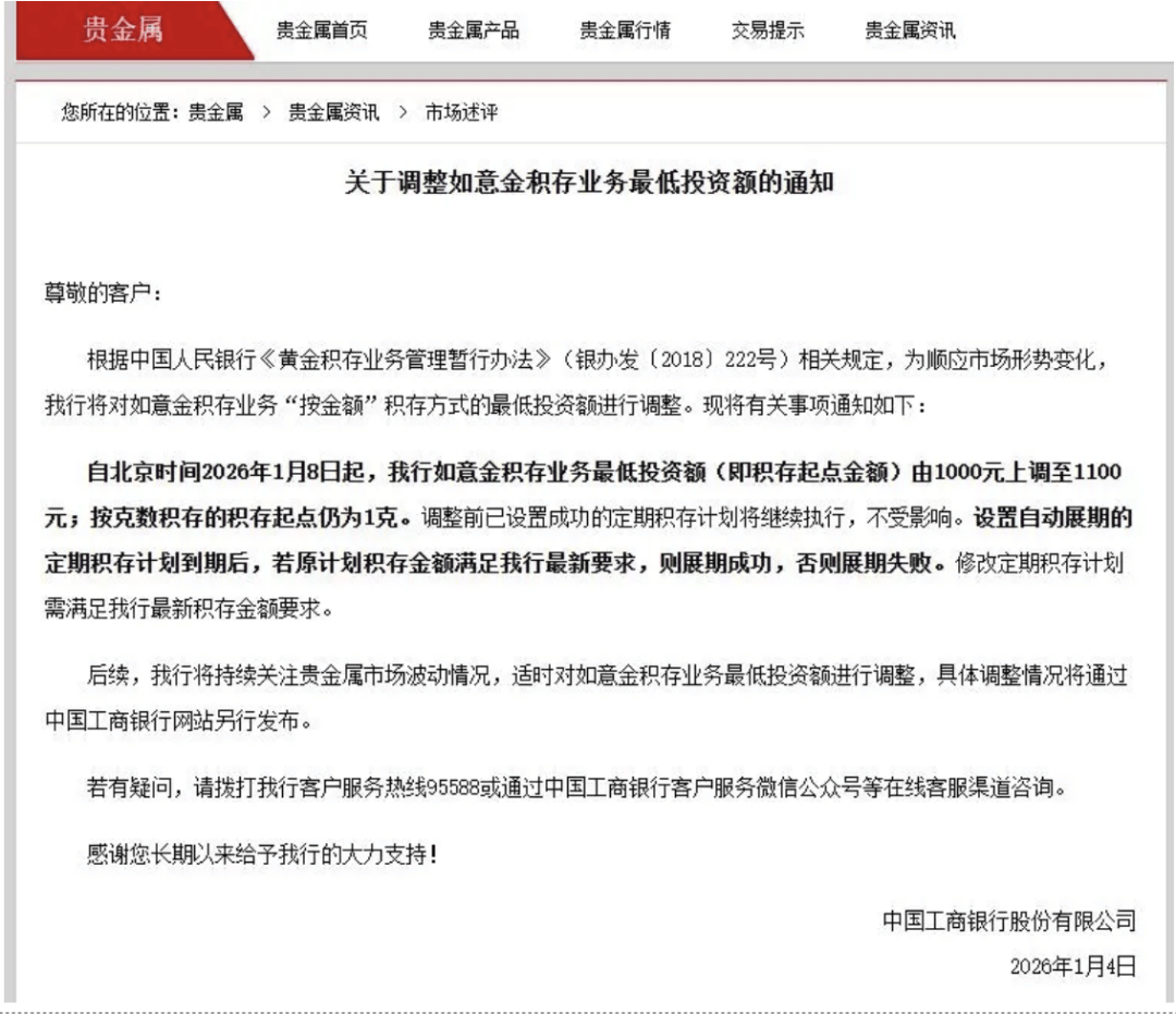 国内市场同样呈现投资热,工行于2026年1月8日上调如意金积存业务最低投资额,从1000元升至1100元,成为当年首个上调积存金门槛的国有大行,从侧面反映出市场投资需求的旺盛。