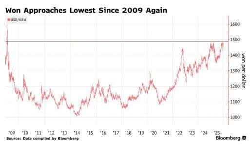 周三,韩元兑美元汇率一度下跌0.25%,触及1美元兑1479.3韩元,不仅连续十个交易日走弱,更逼近2009年3月以来的最低水平。