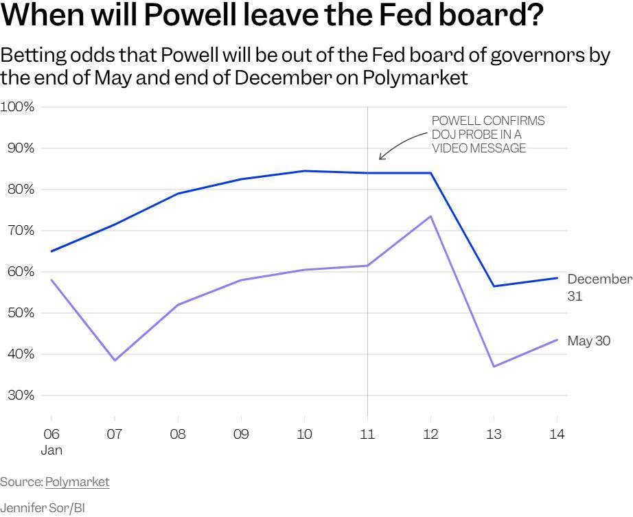 预测平台Polymarket的数据显示,在鲍威尔于1月11日发布视频回应调查后不久,关于他将在5月底以及年底前离开美联储理事会的概率均出现暴跌。