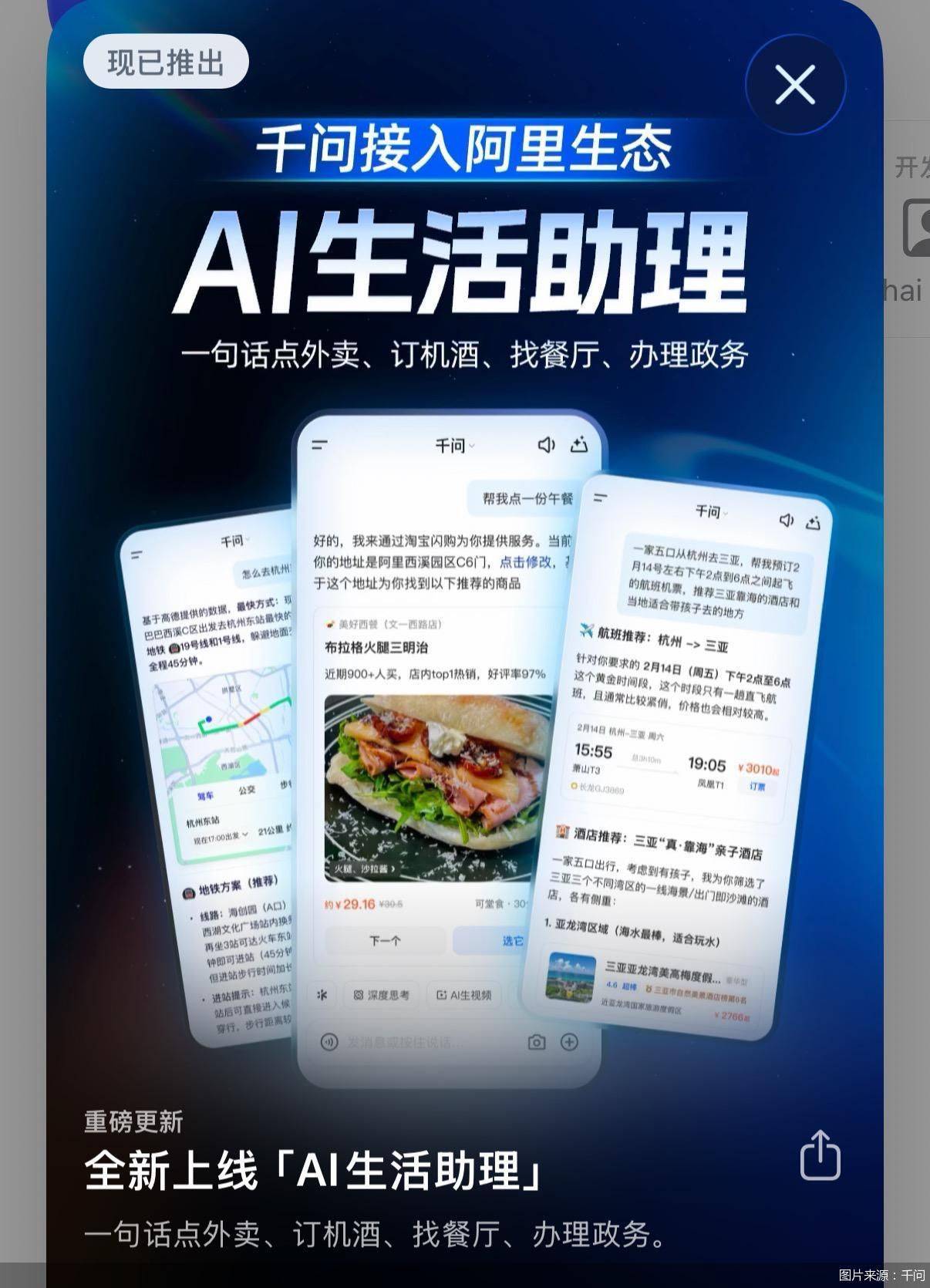 1月15日,千问正式接入阿里生态,定位为AI生活助理,北京商报记者注意到,其目前已全面接入淘宝、支付宝、淘宝闪购、飞猪、高德等阿里生态业务,实现点外卖、买东西、订机票等AI购物功能,并向所有用户开放测试,此次升级将上线超400项AI办事功能。