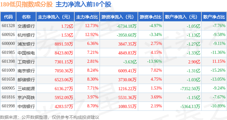 资金流向方面,180低贝(000136)指数成份股当日主力资金净流出合计37.23亿元,游资资金净流入合计18.17亿元,散户资金净流入合计19.06亿元。成份股资金流向详情见下表:
