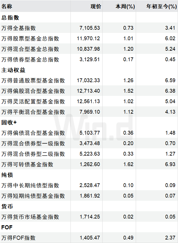最近一周,万得基金指数整体表现平稳。具体来看:万得全基指数上涨0.73%;万得股票型基金总指数上涨1.01%;万得混合型基金总指数上涨1.20%;万得普通股票型基金指数上涨1.26%;万得偏股混合型基金指数上涨1.52%;万得灵活配置型基金指数上涨1.02%。
