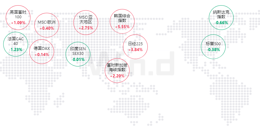 亚洲市场方面:日经225指数大幅上涨3.84%;韩国综合指数上涨5.55%,富时新加坡海峡指数上涨2.20%,印度SENSEX30指数下跌0.01%。