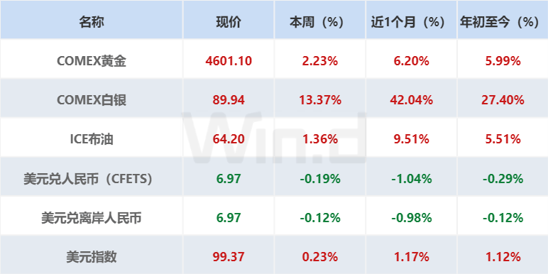 外汇市场方面,美元指数反弹0.623%;人民币对美元汇率小幅波动,美元兑在岸人民币(CFETS)下跌0.19%,美元兑离岸人民币下跌0.12%。